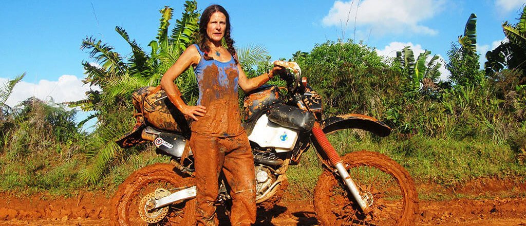 Tiffany rides a bike off a dock into the water, once she gets to the end she goes face first into the river.